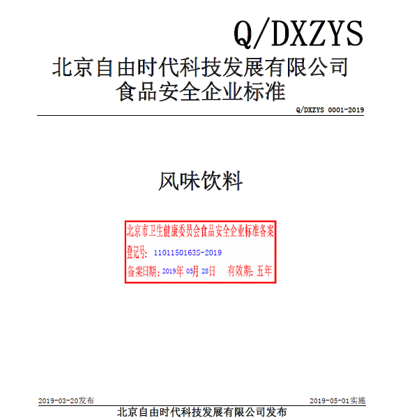 北京自由時代科技發(fā)展有限公司本次備案的企業(yè)標準《風味飲料》,經(jīng)過我公司技術(shù)人員池建敏老師的編寫、備案,所提交的材料符合北京市衛(wèi)健委的備案要求,于2019年05月成功備案并在北京市食品安全標準管理系統(tǒng)公示。
